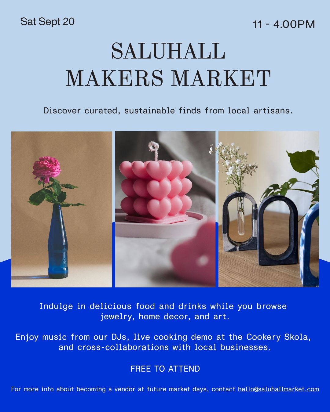 Discover local makers, enjoy a live DJ, and get food from Saluhall vendors. Sustainable creators can apply to be a vendor, and attendees can register for a chance to win Saluhall merchandise.